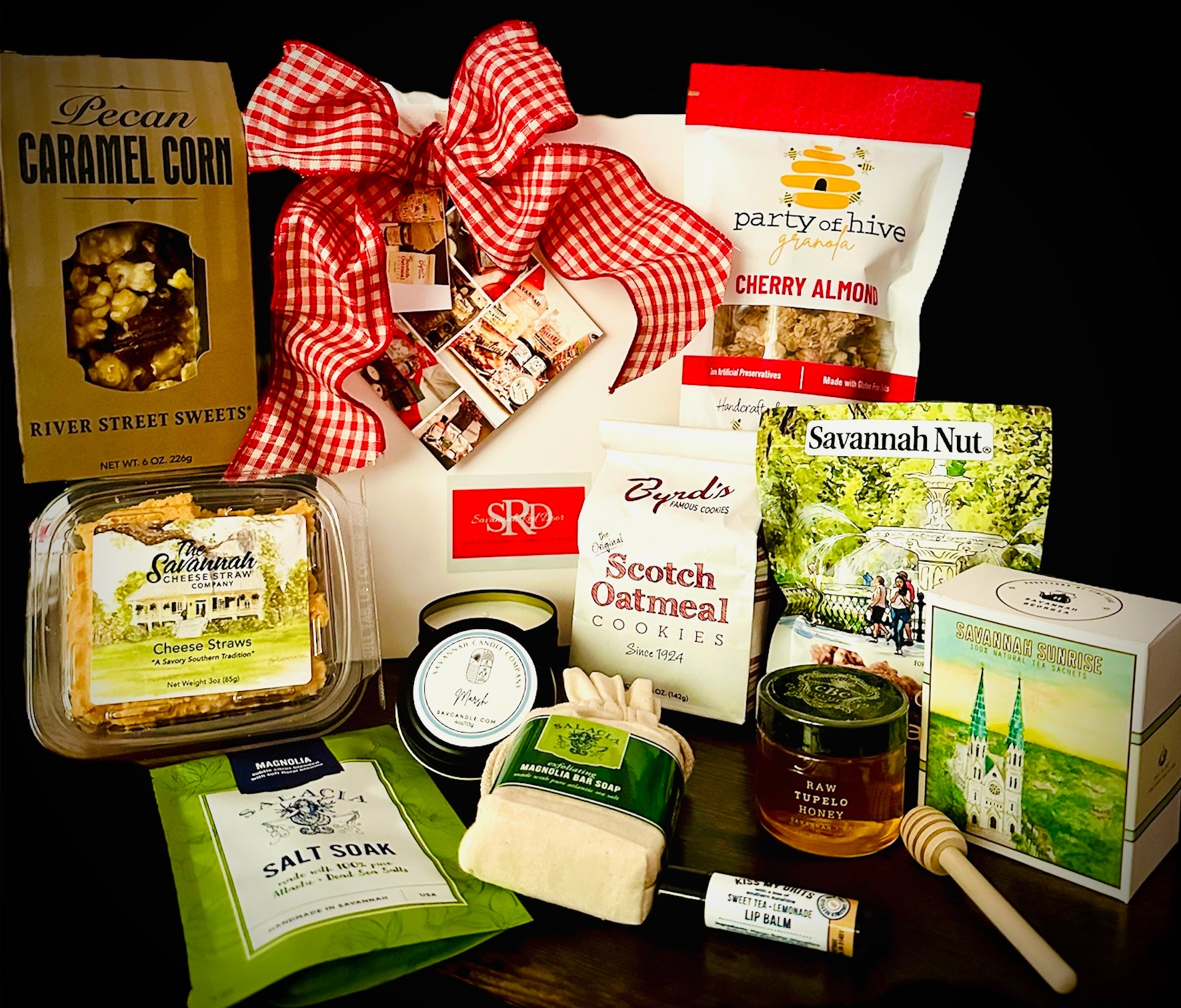 Special Indeed! This gift box includes River Street Caramel Corn, Savannah Cheese Straws, Byrd's Famous Scotch Oatmeal Cookies, Party of Hive Granola, Savannah Nut Praline Pecans, Hale Tea, Capital Bee Honey, and pampering items Savannah Candle with Salacia Salts Soak, Soap, and Sweet Tea Lip Balm.