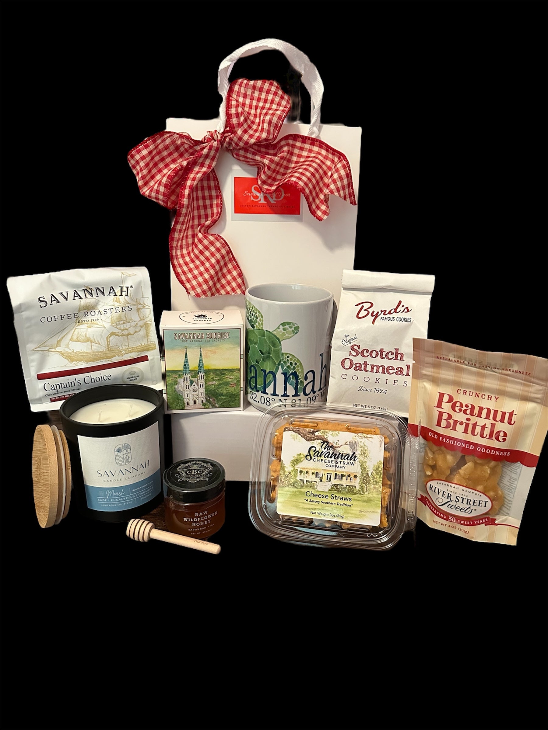 This Savannah gift collection includes Savannah Coffee Roasters ground coffee, Savannah coffee mug, a large Savanah Candle Co candle, Hale Tea, Capital Bee Honey, Byrd Cookies, Savannah Cheese Straws, and River Street Sweets Peanut Brittle. How SO VERY SAVANNAH is that?!